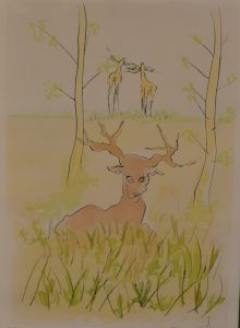 DALI (Salvador). "Le Cerf malade" (1974). Pointe sèche et pochoir, just. E.A., signée au crayon et montée sous passe-partout de soie verte et cadre doré. Planche extraite de "Le Bestiaire de La Fontaine dalinisé". P., Les Maîtres contemporains,...