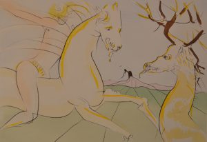 DALI (Salvador). "Le Cheval s'étant voulu se venger du cerf" (1974). Pointe sèche et pochoir sur Auvergne à la main, just. 87/120, signée au crayon et montée sous passe-partout (sans fond). Planche extraite de "Le Bestiaire de La Fontaine...