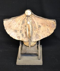 DE VILLIERS (Jephan). "Le Chariot de l'arbre ailé" (1985). Sculpture en bois, écorce et matériaux divers. Pièce unique, titrée, datée et signée à la craie blanche au dos du support. Dim. : 40 x 38 x 25 cm. Sculpteur, peintre, créateur...