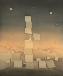 FOLON (Jean-Michel). Sans titre. Eau-forte et aquatinte originale en couleurs tirée sur papier Moulin du Gué, just. 66/90, signée au crayon et montée sous cadre gris en bois. Milan, Alice Editions, s.d., dim. cadre : 60 x 53 cm ; sujet : 37 x...