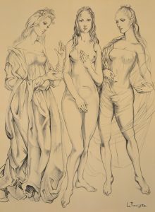 FOUJITA (Léonard). Affiche (1960). Lithographie d'interprétation en couleurs pour l'exposition annuelle "Les Peintres témoins de leur temps" au Musée Galliera à Paris. P., Impr. Mourlot, 1960, dim. : 74 x 50 cm (léger pli angulaire au coin...