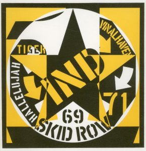 INDIANA (Robert). "Decade : Autoportrait 1969" (1973). Lithographie originale en 3 couleurs montée sous passe-partout et cadre en bois blancs. Planche extraite de la revue XXe siècle. P., Impr. Mourlot, 1973, dim. cadre : 52,5 x 41,5 cm ; sujet :...