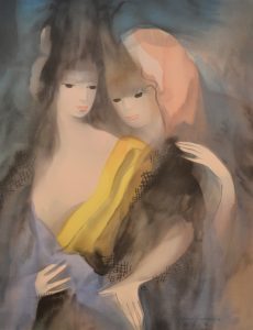 LAURENCIN (Marie). "Complicité". Lithographie d'interprétation en couleurs tirée sur vélin d'Arches, just. 41/200 au crayon et signée dans la planche. Timbre à sec d'éditeur. P., Arts-Litho, s.d., dim. support : 76 x 56 cm ; sujet : 59 x 46 cm.