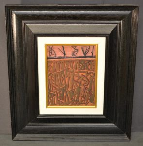 LICATA (Riccardo). Sans titre (1985). Technique mixte sur panneau, datée, signée au coin infér. droit et montée sous passe-partout de soie blanche et large cadre noir en bois. Dim. cadre : 52 x 46 cm ; support et sujet : 24,5 x 19 cm. Riccardo...