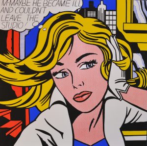 LICHTENSTEIN (Roy). "M-Maybe He Became Ill and Couldn't Leave the Studio" (1967). Sérigraphie en couleurs d'après Lichtenstein, tirée sur papier fort et tamponnée au verso : "Full in your own signature". Dim. support et sujet : 91 x 91 cm. Etat...