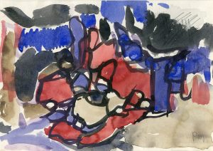 MELS (René). Sans titre (ca 1955). Aquarelle sur papier, monogrammée au coin infér. droit et montée sous passe-partout blanc (sans fond). Dim. : passe-partout : 30 x 40 cm ; support et sujet : 19 x 27 cm.
