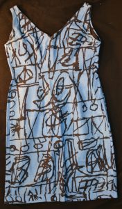 MENDELSON (Marc). Textiles. Ensemble de 5 coupons d'étoffe de coton, façonnés en rideau (4) et en robe (1). Tissus imprimés à la main, certains titrés ("Quadrum" et "Writing"). La robe estivale imprimée en bleu et noir est munie d'une...
