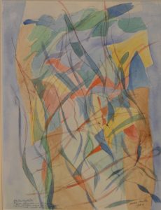 MILO (Emile Van Gindertael, dit Jean). "Die Zauberflöte" (1986). Aquarelle, encre sépia et graphite sur papier, titrée, datée, signée au coin infér. droit et montée sous passe-partout crème et cadre en bois naturel. Dédicace au dos du cadre...