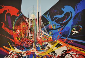 MORETTI (Raymond). "La Ville" (1981). Lithographie en couleurs tirée sur vélin de Rives, just. 16/99 et signée au crayon. P., A. et G. Israël, 1981, dim. support : 50 x 65 cm ; sujet : 38,5 x 56,5 cm.