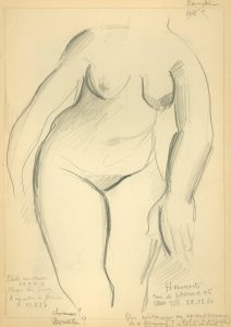 PERMEKE (Constant). "Nu". Crayon gras sur papier, signé "Permeke" au coin supér. droit et monté sous passe-partout crème et cadre en bois naturel. Indications techniques au bord infér. : "Photo existante 22 x 16,5. Plaque chez Joosen. A agrandir...