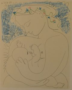PICASSO (Pablo). "Maternité" (1963). Lithographie d'interprétation en couleurs tirée sur vélin d'Arches, datée, signée dans la planche et montée sous cadre crème en bois. Dim. cadre : 68,5 x 50 cm ; sujet : 50 x 39 cm.