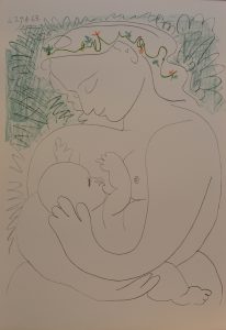 PICASSO (Pablo). "Maternité" (1963). Grande lithographie d'interprétation en couleurs tirée sur vélin d'Arches, datée et signée dans la planche. Cachet d'éditeur au verso. P., Combat pour la Paix, 1965, dim. support et sujet : 50 x 39 cm.