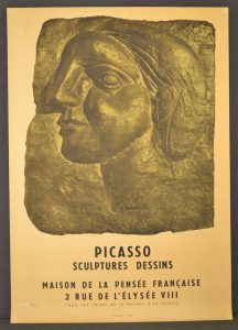 PICASSO (Pablo). Affiche (1958). Phototypie et lithographie en couleurs pour son exposition particulière de sculptures et de dessins à la Maison de la Pensée française à Paris. P., Impr. Mourlot, (1958), dim. : 74 x 52 cm (trous de punaise aux...