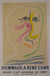 PICASSO (Pablo). Affiche (1969). Lithographie d'interprétation en couleurs par Henri Deschamps pour l'exposition "Hommage à René Char" au Musée d'Art moderne de Céret. P., Impr. Mourlot, 1969, dim. : 78 x 52 cm (Czwiklitzer, 291).