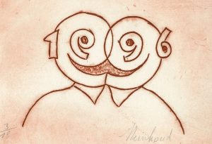 REINHOUD (Reinhoud d'Haese, dit). Sans titre (1996). Gravure originale tirée sur fin vélin blanc, just. 3/18 et signée au crayon. Carte de voeux pour 1996. Dim. support et sujet : 12,5 x 18,5 cm.