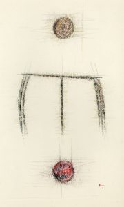 REM (Raymond Coninckx, dit). Sans titre (1966). Crayon gras sur papier, daté, signé au coin infér. droit et monté sous cadre en bois naturel. Dim. cadre : 59 x 43 cm ; sujet : 40 x 20 cm.