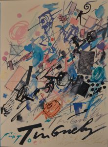 TINGUELY (Jean). Affiche signée (1982). Planche en quadrichromie tirée sur papier glacé pour son exposition personnelle au Palais des Beaux-Arts de Bruxelles. Affiche rehaussée d'un dessin au marqueur noir, signée et dédicacée à Wim Toebosch...