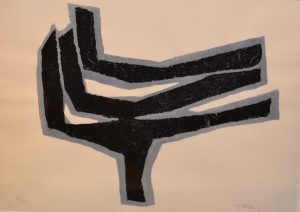 UBAC (Raoul). "Signe de la faux" (1978). Empreinte d'ardoise sur vélin d'Arches, just. 14/25, signée au crayon et montée sous passe-partout et cadre en bois naturel. P., Maeght, 1978, dim. cadre : 71 x 91 cm ; support et sujet : 56 x 76 cm.