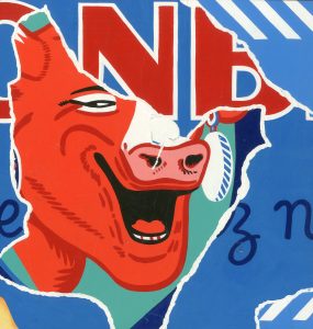 ULMER (Bruno). "Vache qui rit" (1996). Acrylique sur bois, montée dans un caisson en bois naturel, titrée, datée et signée au dos du cadre. Cette peinture fait partie de la série des "Affiches métropolitaines". On joint le livre "Métro super...