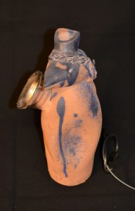 VANDERCAM (Serge). Sans titre (1994). Sculpture-objet. Lampe en terre cuite, peinte, partiellement vernissée, datée et signée en creux. Dim. : 35 x 15 x 15 cm. Pièce unique en état de marche.