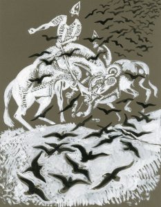 VAN MELKEBEKE (Jacques). "Sennachérib, roi d'Assur, leva le camps et partit. Il s'en retourna à Ninive". Encre de Chine et gouache sur papier, légendée et contrecollée sur papier fort. Dim. support et sujet : 36 x 28 cm. Dessin préparatoire...