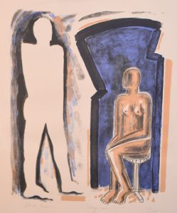 VAN TUERENHOUT (Jef). Sans titre [Figure assise]. Eau-forte originale en noir tirée sur papier vélin. Dim. support : 65 x 50 cm ; sujet : 45 x 30 cm./ THEYS (Yvan). "Blue Room" (2001). Lithographie originale en couleurs tirée sur vélin Zerkall,...