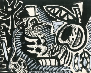 VINCHE (Lionel). "L'Instituteur parle de la pomme" (1982). Huile sur carton, titrée, datée au bord infér., signée au verso et montée sous passe-partout peint (sans fond). Dim. passe-partout : 37 x 44 cm ; support et sujet : 26 x 32 cm.