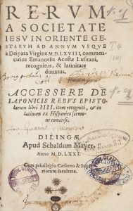 ACOSTA (Emanuel).{CR}Rerum a societate Iesu in Oriente gestarum ad annum usque à Deipara Virgine M. D. LXVII.{CR}Dillingen : Sebald Mayer, 1571. — Petit in-8, (8 ff.), ff. 3-228, (4 ff.). Ais de bois recouverts de peau de truie estampée à...