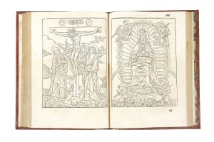 Baudrier, XII, 368.{CR}Édition originale très rare de ce missel de l’église de Nîmes, imprimé à Lyon aux frais du libraire et imprimeur Jean Moylin (14..-1541) à la demande de l’évêque de Nîmes Guillaume Briçonnet. {CR}Ce missel revêt une importance particulière du fait notamment de son calendrier propre à l’église de Nîmes et nous informe ainsi de l’histoire ecclésiastique de cette ville. L’almanach part de l’année 1511 jusqu’à 1545.{CR}L’édition est entièrement imprimée en caractères gothiques rouges et noirs, sur une colonne pour l’almanach et le calendrier, et sur deux colonnes de 37 lignes pour le reste. Elle comporte sur le titre les grandes armes de l’évêque Guillaume Briçonnet qui occupait à l’époque le siège épiscopale de Nîmes, une belle lettrine historiée gravée sur bois en tête du missel, et deux grandes compositions à pleine page gravées également sur bois (f. cliii v° et cliv r°) figurant le christ en croix et le christ en majesté.{CR}Agréable exemplaire en maroquin du XVIIIe siècle arborant sur les plats les armes des états du Languedoc apposées postérieurement. Les doublures et les gardes sont composées d’un superbe papier dominoté, dit papier de tenture (voir page 99). On trouve également sur le troisième caisson, un petit morceau de cuir collé comprenant les armes dorées de la famille Mérez originaire de Nîmes. Famille de chanoines et d’officiers, elle tenait ses armoiries en souvenir de Jean de Mérez qui s’était distingué au siège de Damiette à la première croisade de Saint Louis. La lignée s’est éteinte à la Révolution française.{CR}Dos légèrement passé, quelques épidermures et taches sur les plats, deux petits trous de vers. Mouillure parfois forte tout au long du volume, déchirure sans manque au feuillet V1, réparation dans la marge inférieure de plusieurs feuillets, déchirures dues à l’humidité à certains feuillets du premier cahier. Selon Baudrier, il manquerait le dernier feuillet blanc.