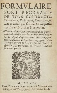 [DU TRONCY (Benoît)].{CR}Formulaire fort recreatif de tous contracts, Donations, Testamens, Codicilles, & autres actes qui sont faicts, & passez par devant Notaires & tresmoins. Faict par Bredin le Cocu, Notaire rural, & Contreroolleur des Basses...