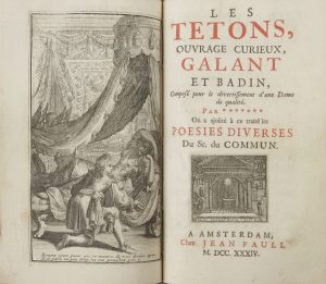 1736.{CR}Les Tétons, ouvrage curieux, galant et badin… On a ajouté à ce traité les poésies diverses Du Sr. du Commun. {CR}Amsterdam : Jean Pauli, 1734. — 3 ouvrages en un volume petit in-8, frontispice, (3 ff.), 96 pp. ; frontispice, (5 ff.), 82 pp., (1 f.) ; frontispice, (3 ff.), 132 pp. Basane marbrée, dos lisse orné, tranches rouges (reliure de l’époque).{CR}Exemplaire en reliure de l’époque, très bien conservée si ce n’est quelques frottements d’usage. Déchirures sans manques à trois feuillets.