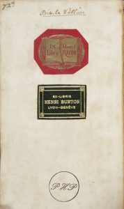 (8 ff.) ; (6 ff.), 221 pp. mal chiffrées 219, (3 ff.). Maroquin rouge, dos à nerfs ornés de roulettes dorées, doublures de maroquin rouge ornées d’une roulette dorée en encadrement, tranches dorées sur marbrure (Luc-Antoine Boyer).{CR}Travail de ver à la charnière du premier plat du second volume et habile restauration au bas du dos de ce même volume.