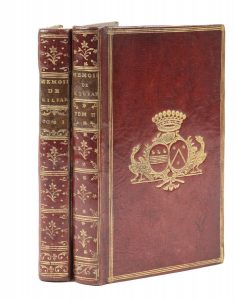 Maroquin rouge, triple filet doré en encadrement et armes dorées au centre sur les plats, dos lisse orné, roulette dorée intérieure, doublures et gardes de tabis bleu, tranches dorées sur marbrure (reliure de l’époque).{CR}Très bel exemplaire. Les dos présentent chacun un décor différent avec cependant un même fer floral au centre des caissons ; le premier volume possède effectivement des fleurs de lys sur la pièce de tomaison et en queue alors que sur le second ce motif est remplacé par des fleurettes et en queue par un oiseau posé sur une volute de feuillage. Ces différences sont volontaires, l’exemplaire a bien été relié à l’origine ainsi. Quelques rares rousseurs