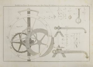 des Pendules à une roue, &c. celle du nouvel échapement, un Traité des engrenages, avec plusieurs Tables.{CR}Paris : Samson, 1767. — In-4, (2 ff.), xxviij, 308, xxxv, 12, 4 pp., 17 planches. Basane marbrée, dos à nerfs orné, tranches rouges (reliure de l’époque).{CR}Fente et petit manque à la charnière du premier plat, frottements d’usage, coins émoussés. Quelques rousseurs éparses, aux premiers feuillets essentiellement. Corrections manuscrites anciennes pages 35, 75, les deux feuillets de la table des chapitres ont été rapportés