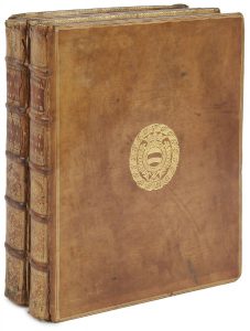 Eclaircissemens.{CR}Paris : Michel David, 1712. — 2 volumes in-4, (12 ff.), 386 pp. ; (5 ff.), 399 pp., (2 ff.). Veau fauve, triple filet doré en encadrement et armes dorées au centre sur les plats, dos à nerfs orné, roulette dorée intérieure, tranches dorées sur marbrure (reliure de l’époque).{CR}Les reliures sont malheureusement très abîmées, les charnières sont fendues, les coiffes arrachées et les coins émoussés avec marques de coups. Manques aux pièces de titre et de tomaison. L’intérieur présente des mouillures claires sur toutes les pages, plus prononcées par endroits, ne gênant cependant pas la lecture;