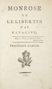 NERCIAT (André-Robert Andréa de).{CR}Monrose ou le libertin par fatalité.{CR}S.l., 1792. — 4 volumes in-8, 179 pp. ; 214 pp., (1 f.) ; 205 pp. ; 200, IV pp., (2 ff.). Basane fauve racinée, roulette dorée en encadrement sur les plats, dos...