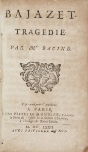 RACINE (Jean).{CR}Bajazet. Tragédie.{CR}Se vend pour l’auteur à Paris : Pierre Le Monnier, 1672. — In-12, (4 ff.), 99 pp. Vélin rigide, dos lisse, chemise à dos de maroquin bleu nuit, étui bordé (reliure de l’époque et chemise-étui...