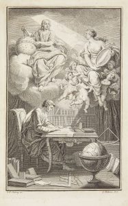 Première édition de cet ouvrage essentiel qui, pour la première fois, introduisit véritablement la pensée de Newton en France.{CR}Voltaire le composa avec l’aide de sa maîtresse Émilie Du Châtelet (1706-1749), à qui l’édition est d’ailleurs dédiée : « Ce n’est point ici une Marquise, ni une Philosophie imaginaire. L’étude solide que vous avez faite de plusieurs nouvelles vérités & le fruit d’un travail respectable, sont ce que j’offre au public pour votre gloire… » (épître).{CR}Cette édition, publiée par Ledet en association avec Jacques Desbordes, fut imprimée et parut sans l’autorisation de l’auteur qui avait décidé d’abandonner le projet suite au rejet de privilège en janvier 1738 et après maintes tracasseries. Ledet était en possession d’une partie du manuscrit de Voltaire que celui-ci lui avait remis ; soucieux de ne pas perdre l’argent déjà investi et mis au courant d’un projet d’édition parisienne, il fit composer quatre chapitres par un mathématicien local pour compléter le texte et fit paraître l’ouvrage en l’état en mars 1738.{CR}L’édition est illustrée d’un frontispice gravé par Jacob Folkema (1692-1767) d’après Louis-Fabricius Dubourg (1693-1775), d’un portrait de l’auteur par Folkema, de vignettes et culs-de-lampe gravés par Folkema, François Morellon de La Cave (1696-1768), Bernard Picart (1673-1733) et Jacob Van der Schley (1715-1779), de nombreuses figures géométriques gravées sur cuivre dans le texte et de 7 planches, dont une dépliante donnant la « Table des couleurs & des tons de la Musique ».{CR}Précieux exemplaire en maroquin rouge de l’époque, portant au dos les armes d’Armand-Augustin de Raffin, marquis d’Hauterive, baron de la Roque-Thimbault, en Guyenne et Gascogne, dit le marquis de Raffin (OHR, pl. 475).{CR}Exemplaire bien conservé malgré un coup ayant abîmé le bord supérieur du second plat. Quelques feuillets roussis, petite perforation au feuillet A4.