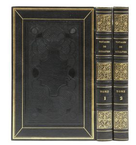 Un des plus beaux livres illustrés par Grandville, contenant, en premier tirage, un frontispice tiré sur Chine, quatre titres frontispices et 450 vignettes gravées sur bois dans le texte ou à pleine page. « Cette illustration occupe l’un des premiers rangs dans l’œuvre de Grandville » (Brivois, 387).{CR}Le texte est précédé d’une longue notice de Walter Scott sur Swift.{CR}Très bel exemplaire dans une reliure pastiche de la fin du XIXe siècle, d’une parfaite exécution. Griffure sur le premier plat du second volume, restaurée. Rousseurs éparses.{CR}Provenance : ex-libris armorié gratté.
