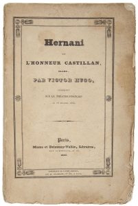 HUGO (Victor).{CR}Hernani ou l’honneur castillan, Drame… représenté sur le théâtre-français le 5 février 1830.{CR}Paris : Mame et Delaunay-Vallée, 1830. — In-8, (2 ff.), VII, 154 pp., 12 et 4 pp. de cat., couverture imprimée....