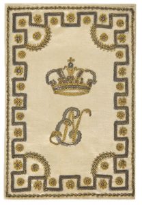 extérieur au point de chaînette réalisé avec des cannetilles dorées et argentées, d’un second encadrement formé de grecques alliant cannetilles et sequin, les créneaux étant parsemés de fleurettes réalisées en cannetilles avec un cœur perlé représentant des roses et des marguerites, coins ornés d’un épi réalisé en cannetilles ; chiffre EN couronné au centre du premier plat, alliant cannetilles et sequin dorés et argentés, et collier de la légion d’honneur composé de même au centre du second plat ; dos lisse muet, tranches dorées, étui-boîte en percaline moderne, doublé de velours saumon (reliure de l’époque).