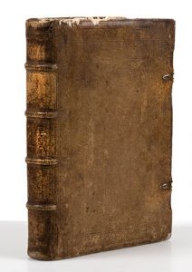 In−fol. (23p)−532p−207p−(56p). Plein vélin à recouvrement ornés de motifs poussés à froid, montage du vélin sur planche en bois. Dos à nerfs. 2 charnière en fer pour la fermeture, une charnière est cassée et manquante. Superbe édition des œuvres de Demothène, texte et annotations en grec uniquement. Cette édition reprend à quelques variantes près l’édition Princeps de Venise de 1504, avec la préface et les notes de Ulpien ajoutées. Tirage sur beau papier [Brunet, II. 587]. Bon état général, trous de vers en début et fin de volume, et dans la reliure Coins abîmé.