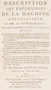 Faujas de Saint−Fond, l’un des mécènes de cette entreprise, géologiste spécialiste de la formation des volcans, rédigea les descriptions immédiatement après les événements. Témoin privilégié et chroniqueur de ce qui allait être l’épopée de la folie des ballons, il relate avec précision les différentes étapes de la conquête de l’air. Du 1er lancer de ballon à Annonay le 4 juin 1783, aux premiers vols habités, d’abord par un coq, un canard et un mouton, devant le roi à Versailles le 19 septembre, puis par les premiers aéronautes, Pilâtre de Rozier et le Marquis d’Alandre, le 21 novembre 1783. De nombreuses personnes le publient ensuite, comme l’Auteur de la seconde partie. Très bon état, petite fragilité au mors du 1er plat.