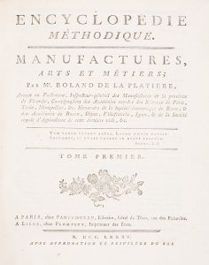 sons. Il est joint : - Encyclopédie méthodique ou par ordre des matières […] Dictionnaire de toutes les espèces de pêches. Paris, Arras, An IV [1796]. In−4. Xv−336p. Texte à deux colonnes. − Recueil de planches de l’Encyclopédie méthodique ou par ordre de matière […] Planches des pêches (…) Paris, Panckoucke, 1793. In−4. 32p. Illustré de 96 planches simples et 36 planches doubles gravées par Benard. soit 114 planches. 3 volumes cartonnés. Intérieurs frais, reliures abîmées, manque des dos. Il est joint : - Table analytique et raisonné des matières contenues dans les XXXIX volumes in-Quarto du Dictionnaire des Sciences, des Arts et des Métiers. Lyon, Le Roy, 1780−1781. 6 vol. in−4. Plein veau. Bon état général frottement aux mors, coins abîmés.
