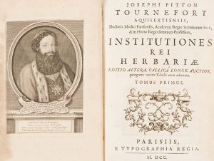 orné. Seconde édition, la première latine. 1 portrait−frontispice gravé par Defrochers, 2 titres gravés et de 476 planches noir et blanc dessinées par Aubriet, gravées sur les cuivres originaux de 1694, pour les t.2−3. Bandeaux, culs− de−lampe, lettrines. Œuvre vraiment fondamentale dans laquelle Tournefort a exposé un nouveau système de classification des végétaux. Très bon état.