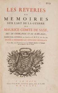 BONNEVILLE (Zacchari Pazzi de) − Les Réveries ou mémoires sur l’art de la guerre de Maurice, Comte de Saxe, Duc de Courlande et de Semigalle (…) La Haye, Gosse, 1756. In−fol. Pleine basane, dos à nerfs orné. Illustré de 44 bandeaux et...
