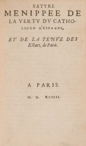 [COLLECTIF] - Satyre menippée de la vertu du catholicon d’Espagne et de la tenue des Estatz de Paris. [suivi de ] Suite du Catho- licon d’Espagne avec l’explication du mot de higuiero d’infierno & autres y contenues. s. l., s. e., 1594....