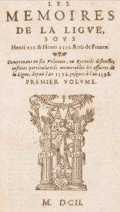 S. Goulart l’Aîné (1543−1628), théologien et controversiste protestant établi à Genève depuis 1566, commença à pu- blier en 1587 un recueil des choses mémorables advenues sous la Ligue qui s’est faite et élevée contre la religion réfor- mée. Comprenant au départ 3 vol., ces «Petits mémoires sur la Ligue» s’augmentèrent régulièrement de nouvelles pièces à mesure que la révolte se développait ; ils finirent par constituer une collection de 6 vol. («Grands mémoires sur la Ligue») allant jusqu’au traité de Vervins (1598) entre Henri IV et Philippe II. [Hauser, III, 1566] Il est rare de trou- ver cet ensemble complet. Assez bon état, reliure très frottée et usée, coißes abîmées. Galeries de vers aux 4 premiers tomes. Légères altérations du texte.