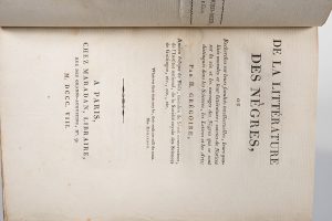 Paris, Maradan, 1808. In−8, XVI−287p−[1p]. Demi−maroquin, dos lisse orné. Reliure postérieure. Exemplaire non rogné. Très rare Edition Originale, puisque unique édition. [Cioranescu II, 32069]. Grégoire, “évêque constitutionnel” de Blois, membre du Conseil des Cinq Cents puis sénateur, prend la défense des nègres et réfute les préjugés sur leur infériorité mentale et morale. Il lutta, pour les droits civiques des juifs, des nègres et des mulâtres nés de parents libres à Saint−Domingue et dans les autres colonies. L’ouvrage est l’une des premières tentatives de réhabilitation du monde dit primitif. L’auteur se flatte à la fin de s’être « imposé le devoir de prouver que les nègres sont capables de vertus et de talents, établi par le raisonnement, plus encore par les faits «. A la Convention il avait fait voter la loi d’abolition de l’esclavage en 1794. Excellent état.