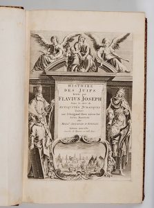 Amsterdam, Chez Georges Gallet, 1700. 2 parties en 1 vol In−fol. (24p)− 1 à 464p−(20p)−477 à 758p−(21p). Carton à l’adresse du titre corrigeant «Cez» en «Chez». Illustré d’un titre−frontispice, lettrines, culs de lampe, 2 cartes en couleurs dépliantes gravées par Pierre Mortier, 1 planche double des figures des cérémonies des juifs et environ 200 gravures in−t. gravées. Texte sur 2 co- lonnes. Plein maroquin, dos à nerfs orné, plats décorés d’encadrements et guirlandes dorées, et de fleurons aux angles, roulettes aux contreplats, toutes tranches dorées. La traduction de l’homme d’état et poète Robert Arnauld d’Andilly (1589−1674) parut pour la première fois en 1667. [Brunet III−572.] Très bon état, coins abîmés, coiffes frottées, quelques épidermures.